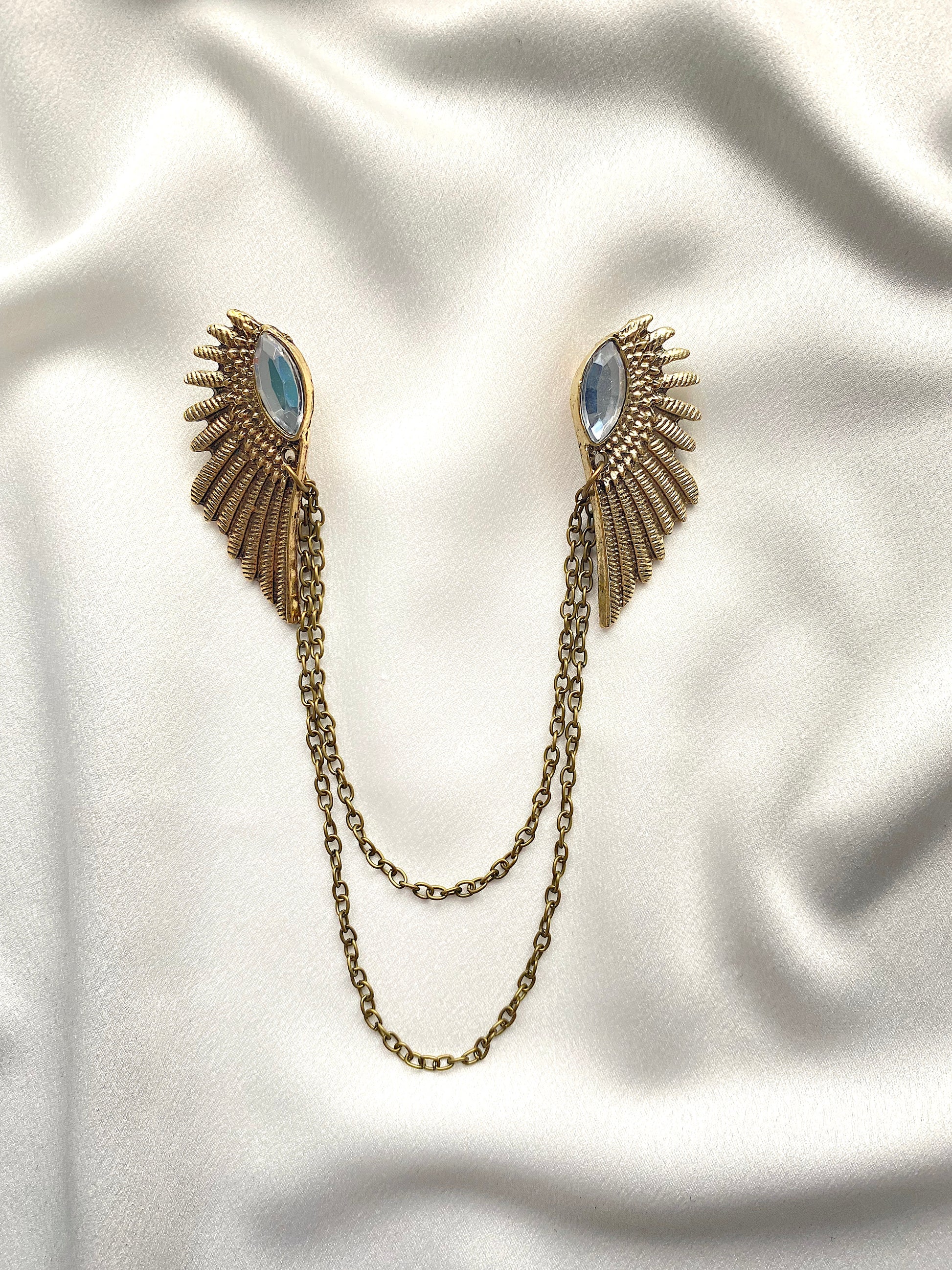Pin metalic Chanya cu lanț și cristale, tip insigna, cu fluturaș de prindere.